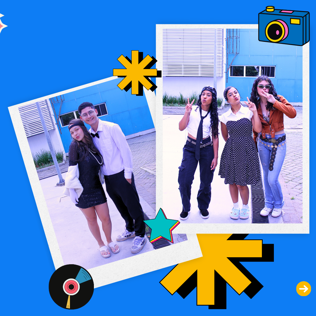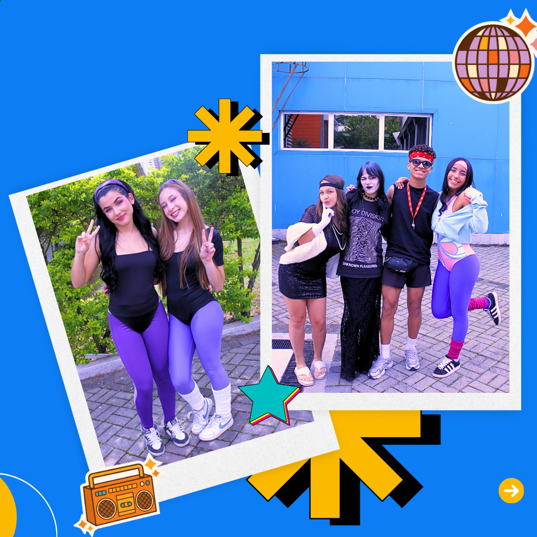 O tema escolhido foi Décadas, e cada aluno caprichou na fantasia representando uma época diferente — dos anos 60 aos 2000, teve estilo para todos os gostos! 🕶️🎤📺