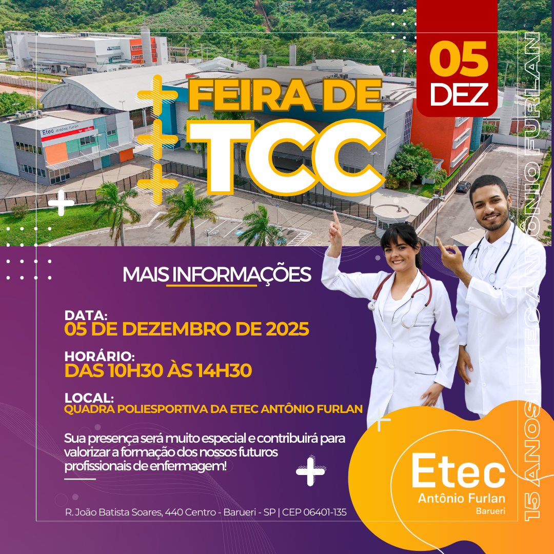 Gostaríamos de convidá-los(as) para a nossa Feira de TCC do 3º Módulo do curso Técnico em Enfermagem! Uma oportunidade única para conferir os trabalhos incríveis desenvolvidos pelos nossos alunos. Sua presença será muito importante para nós! 🙏💙