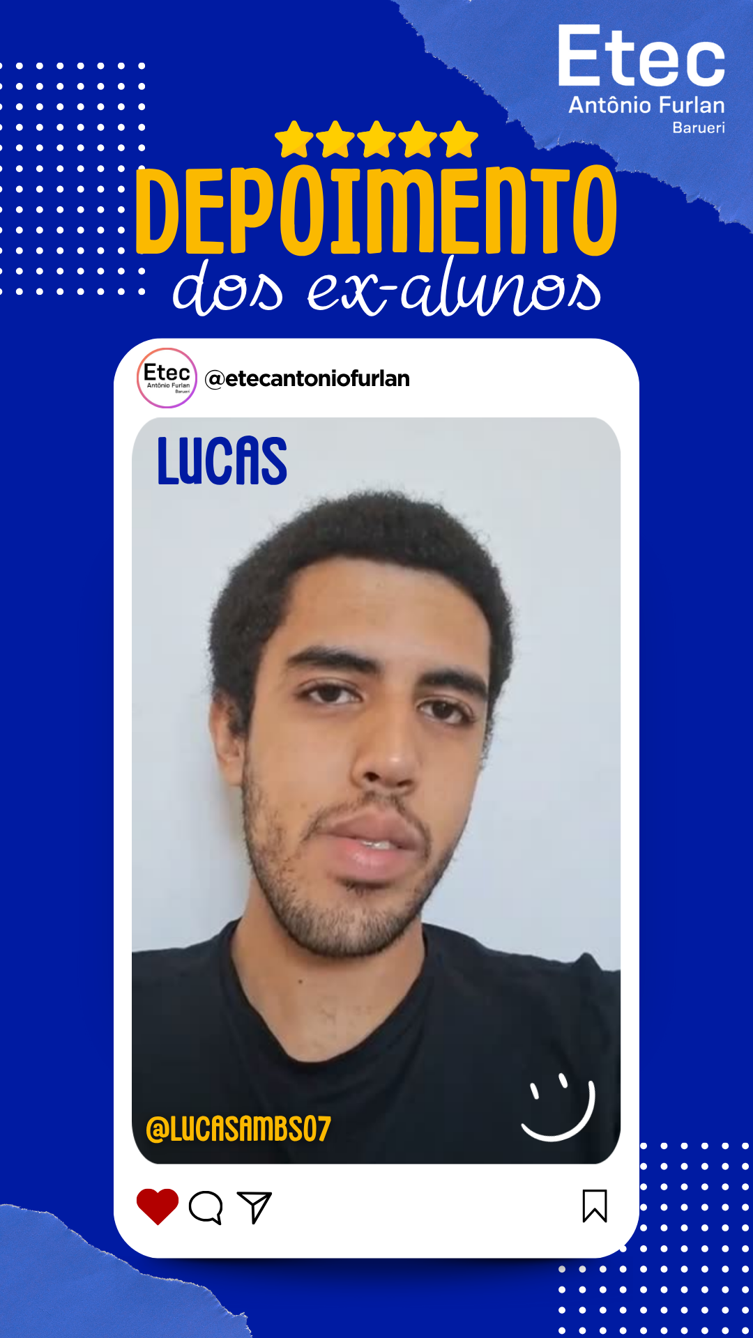 Recebemos com muito carinho o depoimento do nosso ex-aluno Lucas Antonio (@lucasambs07), formado em 2018 no curso de Ensino Médio Integrado ao Técnico em Contabilidade. 📚