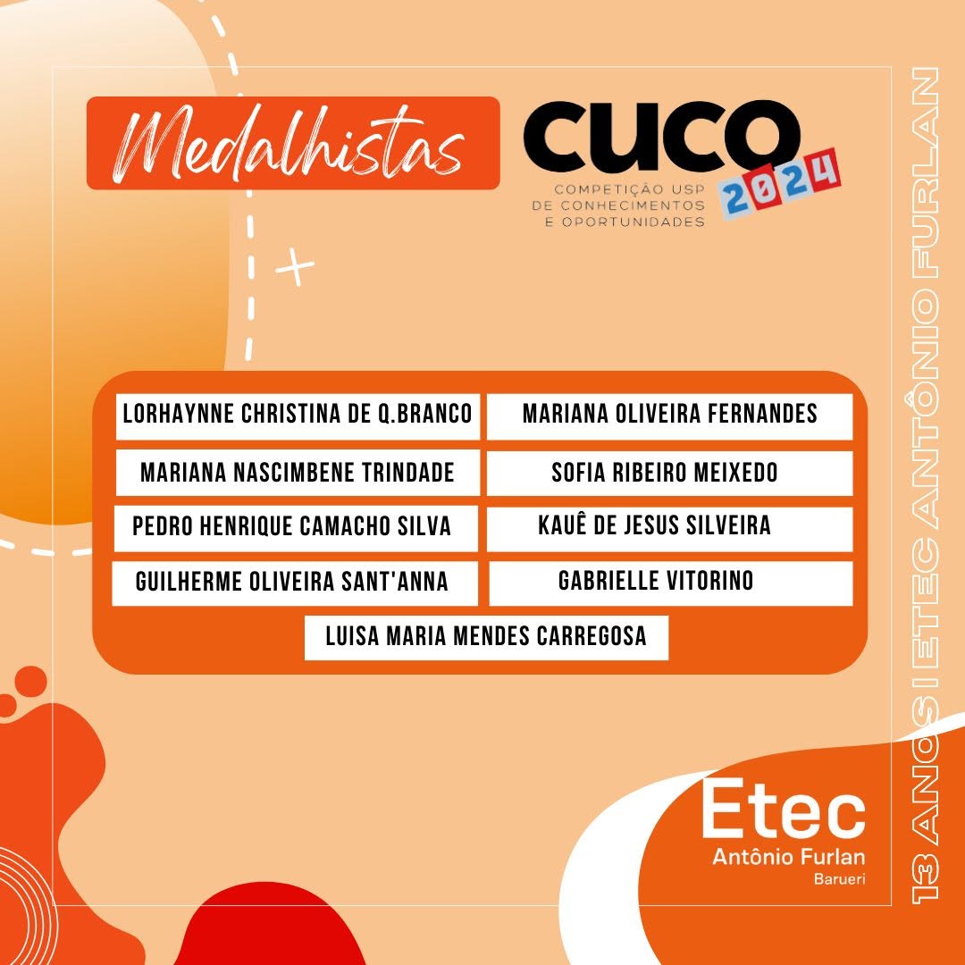É com imenso orgulho que compartilhamos o excelente desempenho de nossos(as) alunos(as) na Olimpíada Brasileira do Conhecimento (CUCO) 2024! Nossa ETEC conquistou 9 medalhas e 70 menções honrosas. 🎉💙