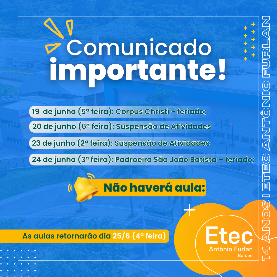 📚 As aulas retornarão normalmente no dia 25/06 (quarta-feira).
