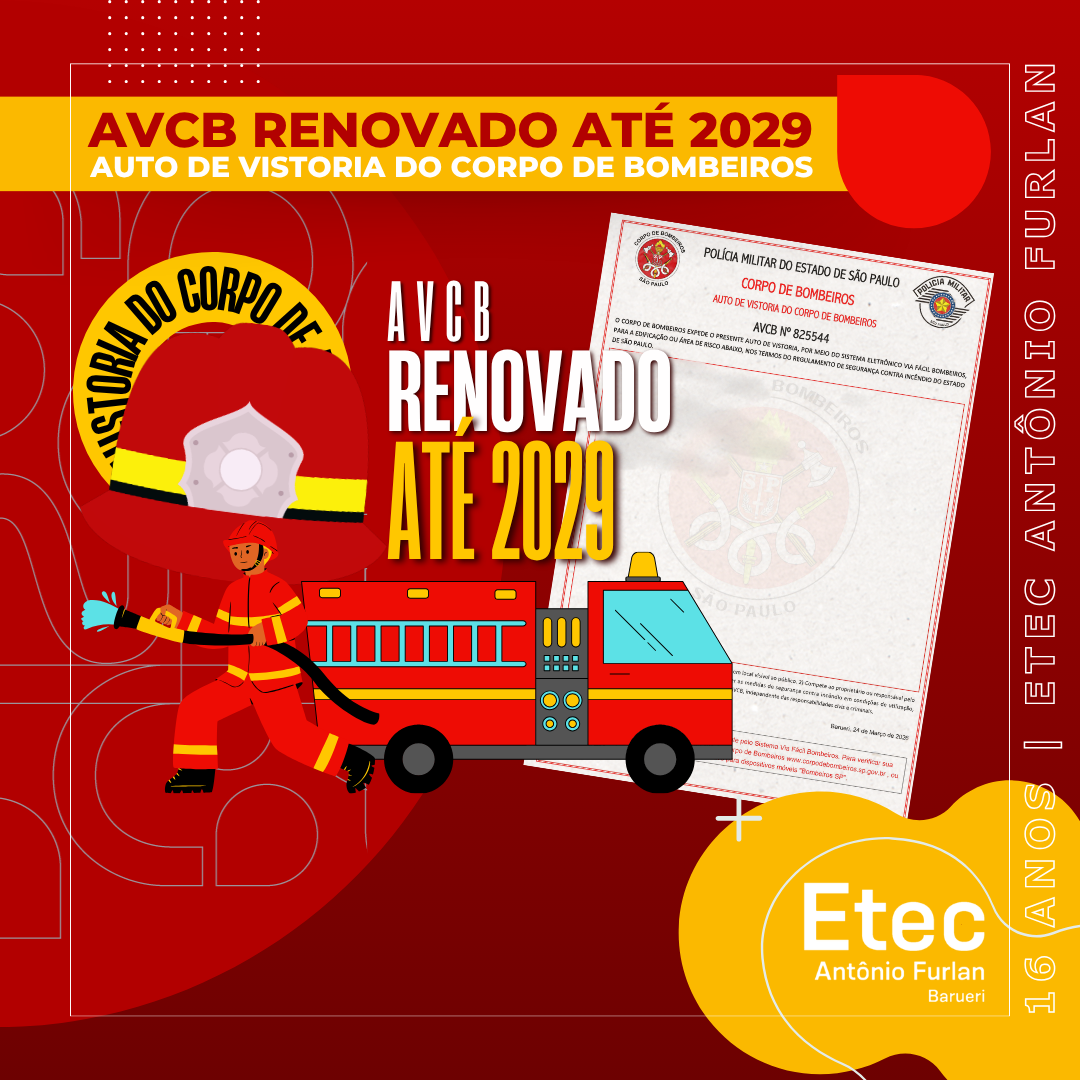 Temos uma notícia importante para toda a nossa comunidade escolar! Informamos que o Auto de Vistoria do Corpo de Bombeiros (AVCB) da nossa unidade foi oficialmente renovado e possui validade até 23/03/2029. 🗓️🏢