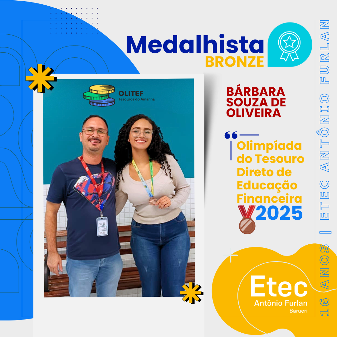 Temos o imenso orgulho de compartilhar mais uma conquista brilhante da nossa unidade! A nossa aluna Bárbara Souza de Oliveira (@xbarbyyy), do curso de Ensino Médio com Habilitação Técnica em Marketing, recebeu oficialmente sua Medalha de Bronze da Olimpíada do Tesouro Direto de Educação Financeira (OLITEF) de 2025! 🏆👏
