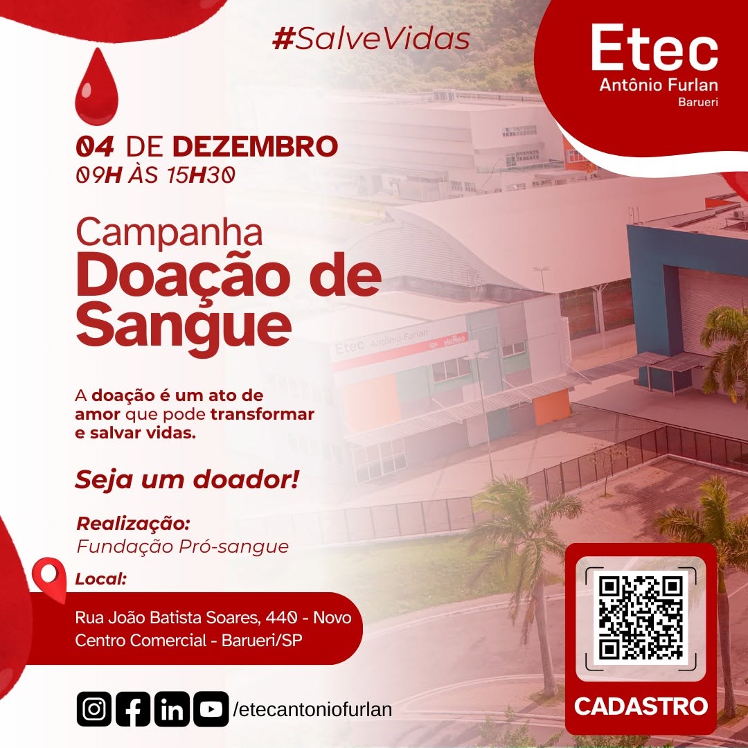 A Fundação Pró-Sangue do Hemocentro de São Paulo estará realizando as coletas aqui mesmo na ETEC, e você pode ser um doador! O evento é aberto ao público, então convide seus amigos, familiares e toda a comunidade para participar dessa ação solidária.