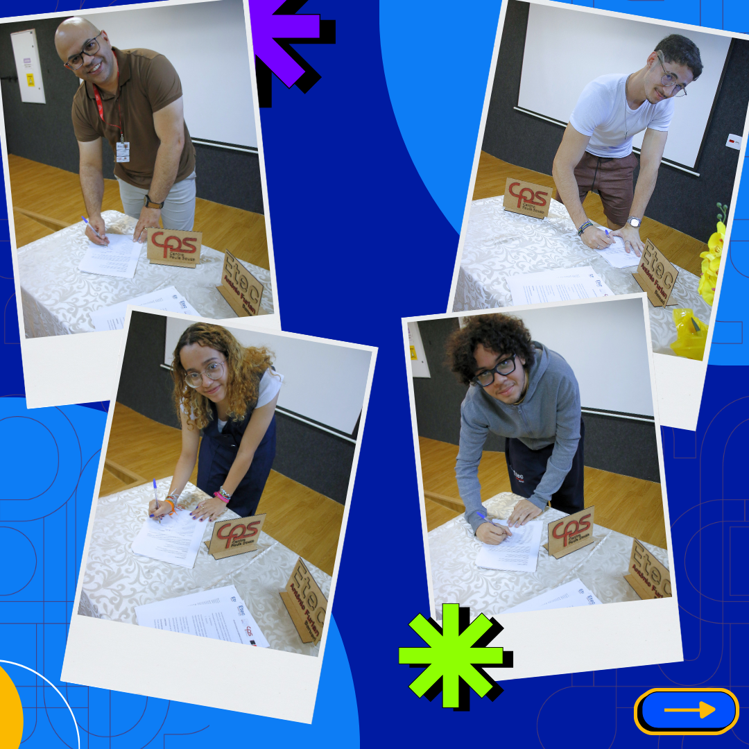 Confira nos registros o momento oficial da assinatura, onde cada membro assumiu a responsabilidade de trabalhar por uma escola ainda melhor e mais integrada.