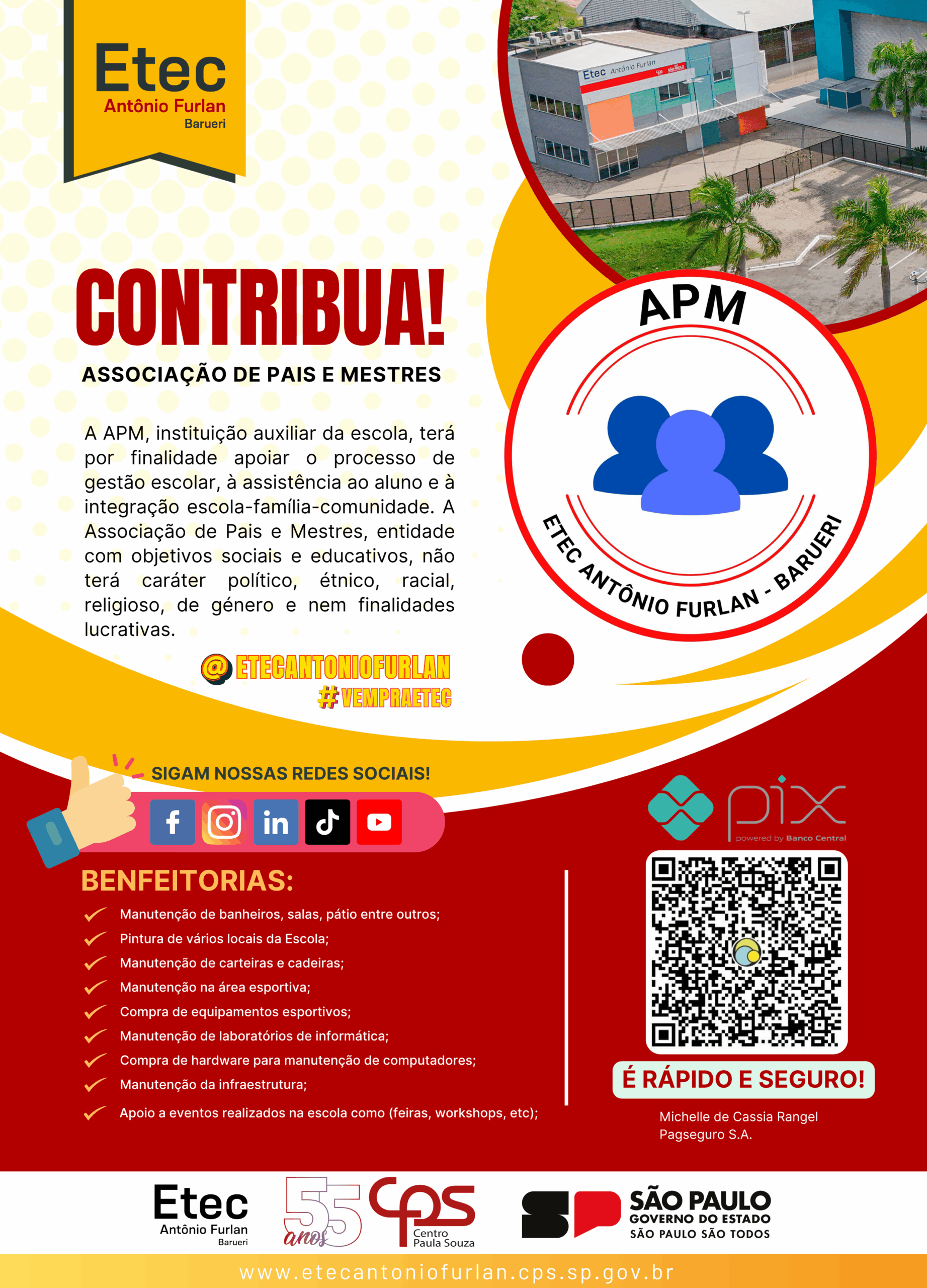 Qualquer pessoa pode contribuir financeiramente para a manutenção da APM e de suas ações para a melhoria da estrutura e serviços oferecidos pela Etec Antônio Furlan